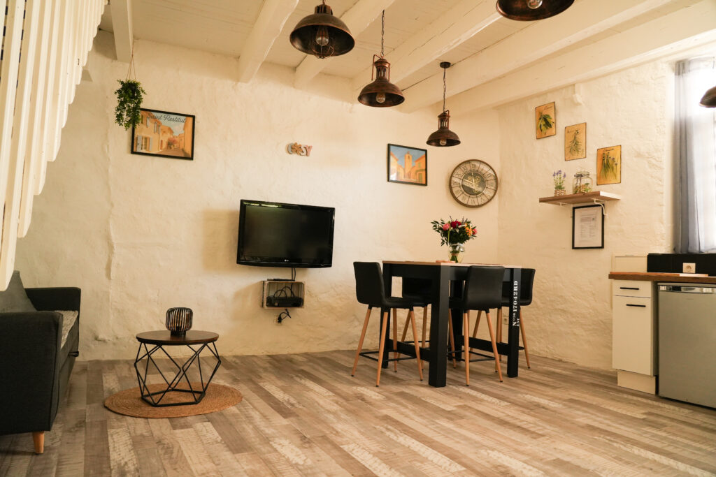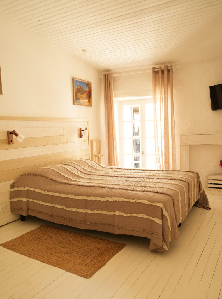 Logement en pierre, 2 terrasses, vue directe sur la place centrale animée : pétanque, rires, restos, épicerie, tout est là. Grande chambre + vrai canapé-lit.